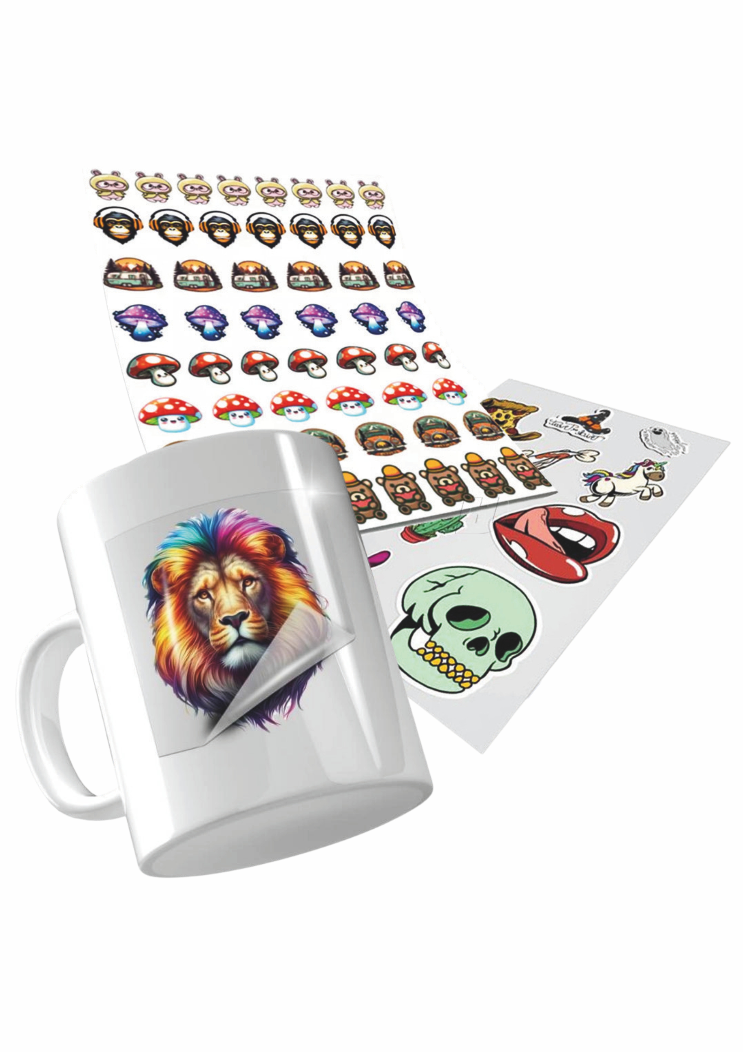 O adesivo DTF UV é produzido com tinta curada por luz ultravioleta, garantindo alta definição, resistência e cores vibrantes.